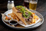 Italian beef sliced thin with your choice of giardiniera, sweet peppers, mozzarella cheese or all three for no extra cost. Served with chips or steak fries.