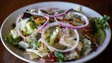 Our famous Italian salad is deliciously dressed with our own wine vinegar and olive oil blend and topped with tomatoes and onions.