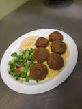 Four pieces of falafel, hummus, baba ganoush, tabbouleh, salad & dolmas.