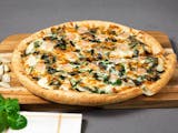 Alfredo sauce, fresh baby spinach, parmesan cheese, fresh chopped garlic, Sarpino's gourmet cheese blend and baby shrimp on top.