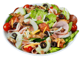 Tender grilled chicken strips, lean Canadian and smoked bacon, freshly sliced pepperoni, black olives, ripe tomatoes, crunchy green peppers, crisp cucumbers, our signature gourmet cheese blend and onions served over a bed of Romaine lettuce.
