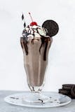 Delicious cookies and cream ice cream topped with whip cream and chocolate sauce