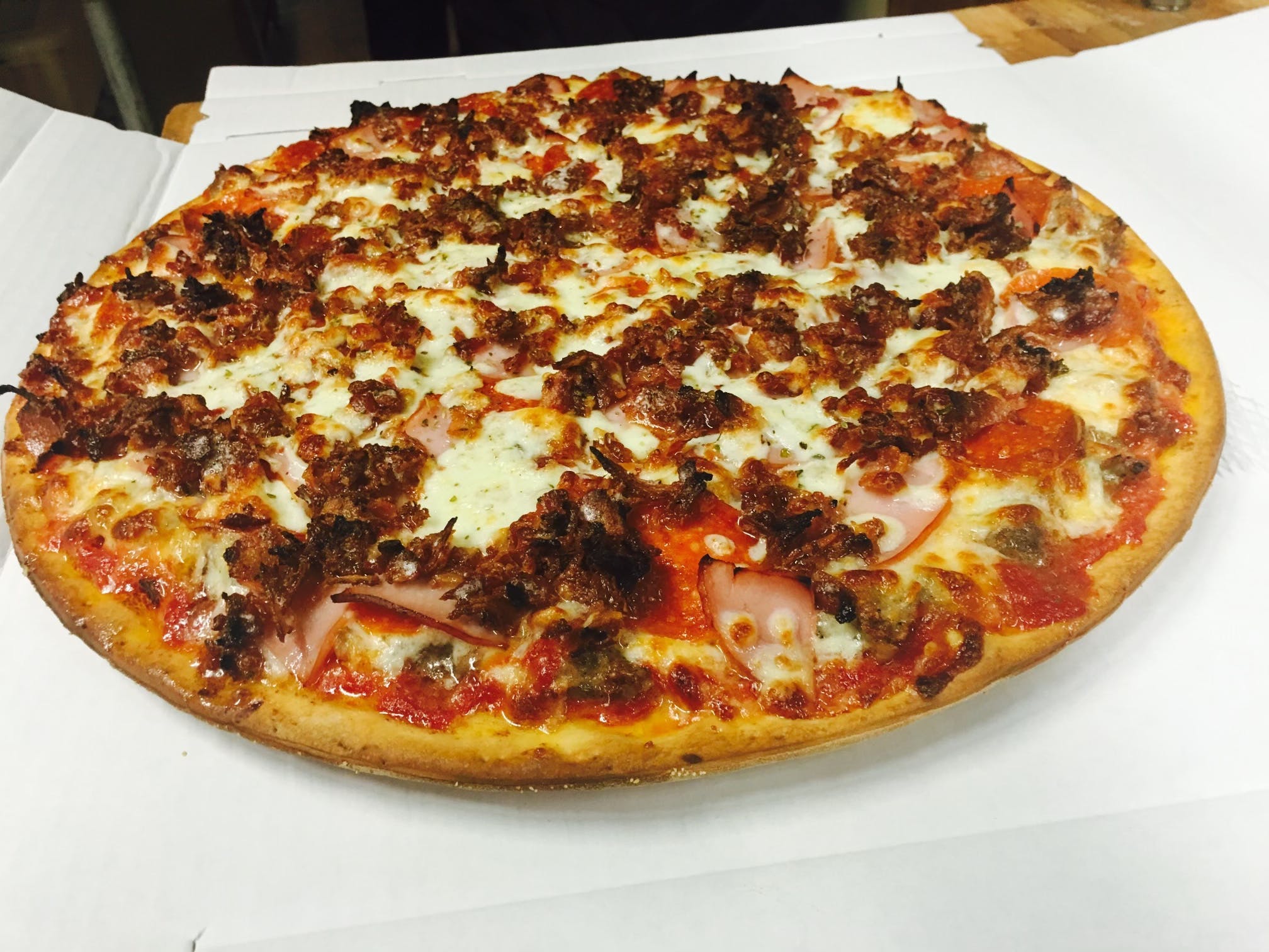 Huge portions of sausage, pepperoni, bacon, mushrooms, onions, green peppers, and green and black olives.