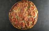 A layer of papa saverio's own blend of olive oil, with fresh garlic, mozzarella cheese, topped with sweet pomodoro tomato, sausage on double dough crust (no red sauce).