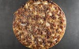 Juicy chunks of ribeye steak, sauteed onions, garlic & mushrooms in olive oil served on double dough crust and all smothered with mozzarella cheese (no red sauce).