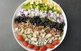 Our crispy fried chicken tenders sliced and mixed with bacon, lettuce, red onions, tomatoes, cheddar cheese and ranch dressing.