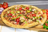 Pizza sauce, spicy ground beef, freshly sliced salami & pepperoni, spicy Italian sausage, jalapenos, red chili peppers, & our signature gourmet cheese blend.