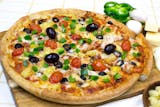 Flavorful garlic pesto sauce, tender grilled chicken strips, artichoke hearts, onions, fresh red & green peppers, our signature gourmet cheese blend & a sprinkle of sharp Parmesan cheese.