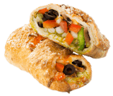 Veggie. A hearty mix of black olives, vine-ripened tomatoes, plump fresh mushrooms, sauteed onions & our signature gourmet cheese blend wrapped in a golden-brown crust, brushed with rich garlic butter & sprinkled with Parmesan cheese.