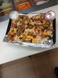 Choice of beef or chicken on top of tortilla chips, nacho cheese, lettuce, tomatoes, jalapenos, black olives, sour cream and salsa.