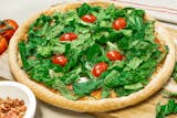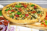Sun-dried tomatoes, red and green peppers, fresh spinach leaves, onions, roasted garlic, cheddar and Sarpino's gourmet cheese blend on a bed of pesto sauce.