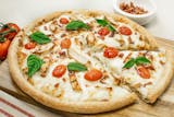 Alfredo sauce, grilled chicken strips, bacon, garlic, tomato, fresh basil topped with Sarpino's gourmet cheese blend and Parmesan cheese.