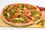 Olive oil on the thin crust, topped with fresh tomatoes, grilled chicken & sarpino's gourmet cheese blend, baked in the oven, then loaded, with romaine lettuce, caesar dressing, feta & parmesan cheese.