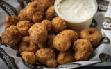 3 buffalo wings, 3 mozzarella sticks, 3 poppers & breaded mushrooms.