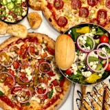 Loaded with bacon, sausage, pepperoni, green bell pepper, mushroom, red onion, black olives, mozzarella & parmesan cheese.