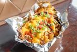Basket tots, smoked pork, scallions, cheese sauce, Fat Dan's hot sauce.
