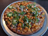 Our Signature Pizza with delicious Tandoori sauce, freshly marinated tandoori chicken, diced mozzarella cheese, fresh mushrooms, crisp red onions, freshly chopped garlic, ginger, green chilies and fresh cilantro.