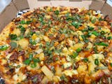 Our Signature Pizza with delicious curry sauce, freshly marinated curry chicken, diced mozzarella cheese, fresh mushrooms, black olives, crisp red onions, freshly chopped garlic, ginger, green chilies and fresh cilantro.