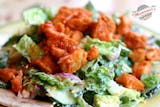 Buffalo chicken breast strips, mixed greens onions, tomatoes, cheddar cheese.