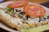 Roast beef, onions, green peppers, mushrooms, cheese, lettuce, tomatoes & mild horseradish sauce.