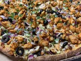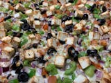 Made with our homemade marinara sauce, Mozzarella cheese, Pepperoni, freshly sliced Mushrooms, freshly chopped Red Onions, crisp Bell Peppers, sliced Black Olives, Italian sausage and freshly grilled and diced chicken breast