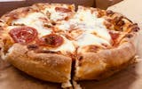 Our supreme pizza! Sausage, pepperoni, beef, ham, bacon, mushrooms, onions, green peppers, green & black olives, banana peppers.
