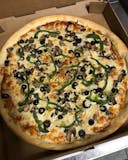 Pepperoni, Canadian bacon, onions, mushrooms, black olives, green peppers, Italian sausage, and minced garlic. Jalapenos and anchovies upon request.