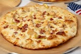 Alfredo sauce, mozzarella cheese, salami, pepperoni and bacon-topped with cheddar and parmesan cheese.