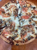 Pepperoni, sausage, hamburger, onions, green peppers & mushrooms.