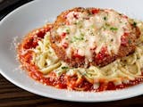 Roasted eggplant layered with pomodoro sauce served over pasta with melted romano and mozzarella cheese.