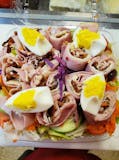 Lettuce, red onions, cucumbers, eggs, tomatoes, and green peppers.