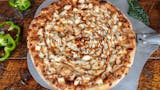 Chicken, pesto, tomatoes, garlic, mozzarella cheese & aged parmesan. White pizza.