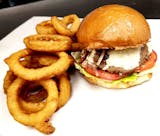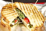 Fresh mozzarella, Tomatoes, Pesto (nut free), Arugula, special house dressing on a sourdough bread toasted in olive oil.