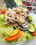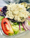 Chicken salad (shredded chicken with mayo, celery, carrots) with Lettuce, tomatoes, red onions, cucumbers, tomatoes, olives, red cabbage and pickles.