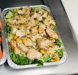 Rotini, Pesto sauce (Nut free), House dressing, Arugula, Fresh mozzarella, cherry tomatoes.