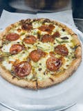 Fresh mozzarella, homemade (nut-free) Pesto, Pepperoni and hot honey drizzle.