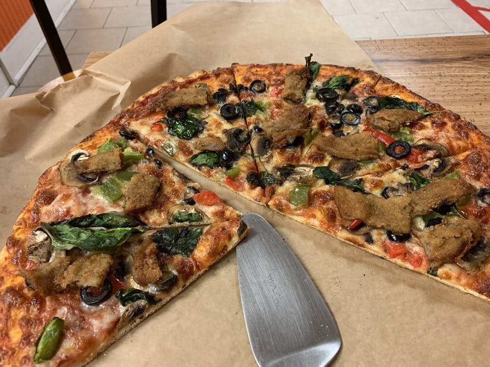 Regular dough freshly made, mozzarella cheese with a touch of buffalo cheese, topped with bell peppers, sliced fresh mushrooms, eggplant, fresh spinach and olives.