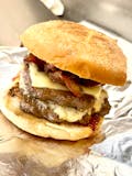 Cheeseburger, bacon, mozzarella cheese and tomato sauce.