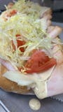 Thousand island dressing, hamburger, pickels, onion, Tomatoes and pizza cheese