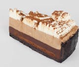 New York cheesecake topped with rich caramel, chocolate drizzle, and whole pecans for a decadent finish.