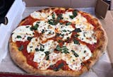 Fresh mozzarella, basil, and red sauce. Personal is 10” (6 slices); Small is 14” (8 slices); Medium is 18” (12 slices); Large is 25” (24 slices); Party is 30” (32 slices)
