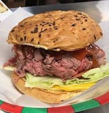 Cheeseburger, onion, pizza cheese, pickles, thousand island dressing on top with shredded lettuce.