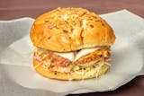 Onion roll, lettuce, tomato, mayonnaise, and cheese.