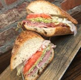 Imported italian prosciutto, salami, capocollo, mortadella, soppressata, provolone cheese, lettuce, tomato, onion, finished with Italian dressing. With or without hots. ****Bread choice subject to availability****