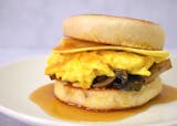 Just Egg, vegan smoked gouda and blue oyster mushroom hash with maple-sriracha syrup on our Flourhouse english muffin