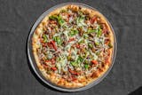 Sauceless cheese pizza topped with chicken, caesar salad & 3 cheese blend.