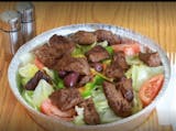 Steak tips or chicken, feta cheese, romaine, olives, tomatoes, cucumbers, and Greek dressing.