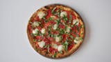 Tomato sauce, chorizo, roaman parmesan, crushed red pepper and fresh basil. Molho de tomate, luinguica italiana, parmesão, pimentão vermelho e manjericão.