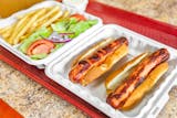 Indulge in our mouthwatering hot dog dinner featuring 2 large hot dogs on buttered buns served with a side of fries and salad. Or, customize your sides to your liking with options such as onion rings, rice, or double portions for a meal tailored just for you.