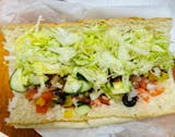 Savor the goodness of our veggie sub, brimming with freshly sliced tomatoes, onions, green peppers, Kalamata olives, lettuce, diced cucumbers, oil, vinegar, hot peppers, and a dash of salt & pepper, all nestled within our French bread sub roll for a refreshing and flavorful experience.